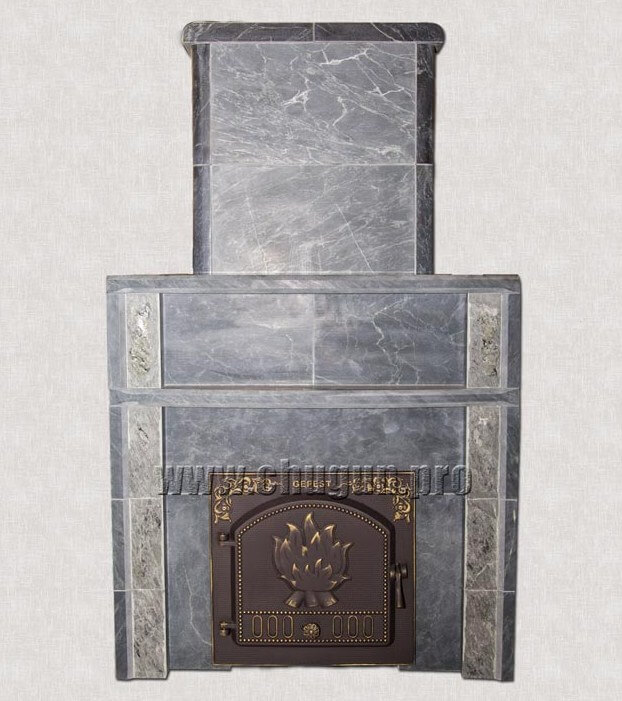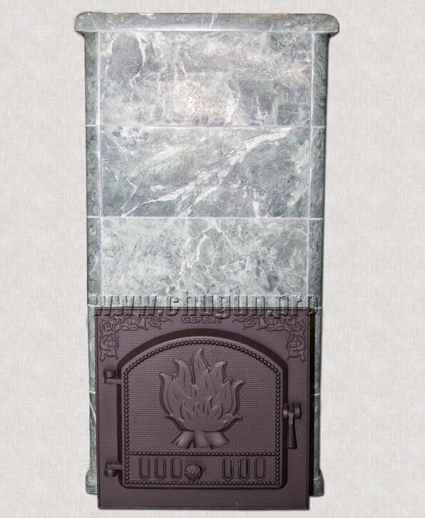 Дверца оформлена декоративным узором, имеет панорамное стекло, может успешно выполнять функцию закрытого камина в смежном помещении.