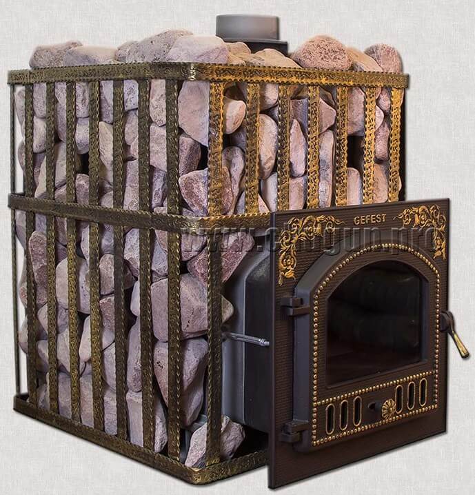 Каменка с глубоким дном ─это особая отличительная черта печи Гефест ПБ-02 ПС 3К, она осуществляет процесс, где камни нагреваются со всех сторон. А выносной портал имеет дверку из чугуна, она оснащена высокопрочным стеклом, позволяющим вести наблюдение с другого помещения, например, из предбанника, за процессом всей работы печки.