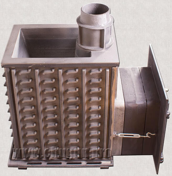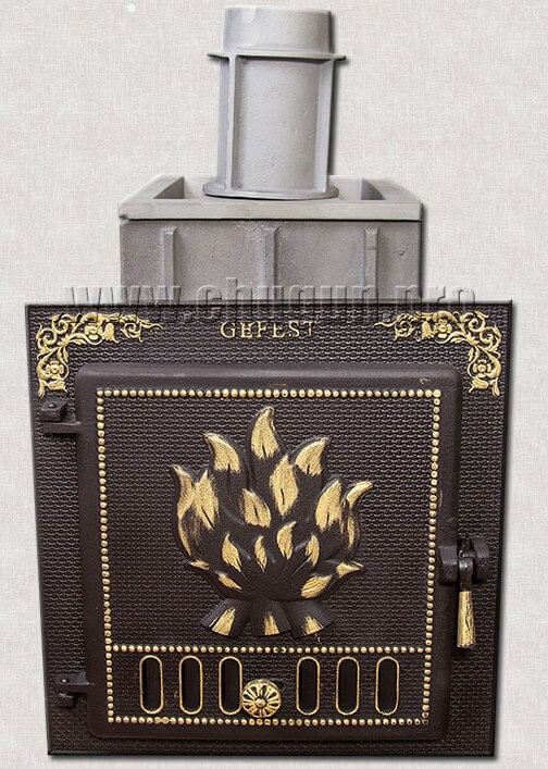 Чугунная печь Гефест ПБ-03 3К имеет углублённую на 16 сантиметров по сравнению с базовой моделью топку. Оснащена системой вторичного дожига, быстро доставляющей в топку кислород, обеспечивающий мгновенный обогрев парной. Увеличение высоты печи всего на 70 мм позволило нарастить её мощность до 20 киловатт. Дверца из художественного литья украшает фасад.