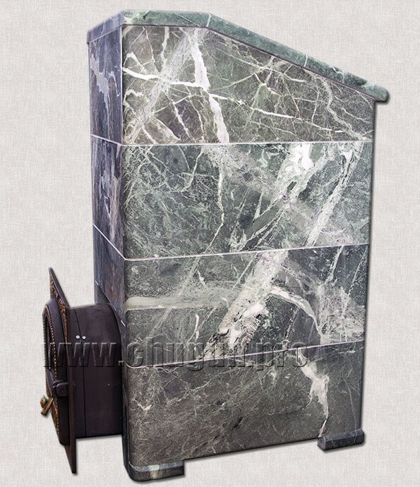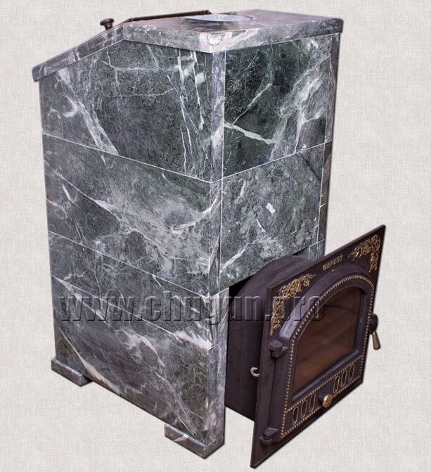 Печь паровая Гефест ПБ-03 П 3К Президент — модель с закрытой каменкой, облаченная в талькохлоритную облицовку с уникальным природным рисунком. Чугунная конструкция оснащена дополнительными ребрами, удлиненным порталом, расширенным основанием дымохода это увеличивает объём теплоотдачи и аккумулирования жара. Быстрое достижение максимально высокой температуры способствует образованию густого легкого пара.