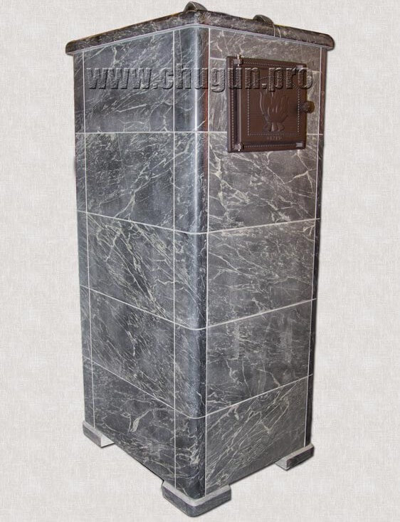Печь Гефест ПБ-03 Русская парная — удобная модель чугунного нагревательного устройства с закрытой каменкой. Облицовочный материал — талькохлоритный натуральный камень серого цвета, помогает аккумулировать тепло и образовывать легкий водяной туман. Паровая дверца расположена сбоку, это защищает человека от ожогов.