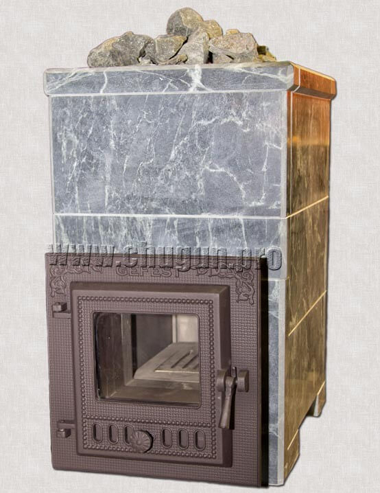 Модель декорирована литыми узорами, дверь с жаростойким стеклом, имитирует закрытый камин.