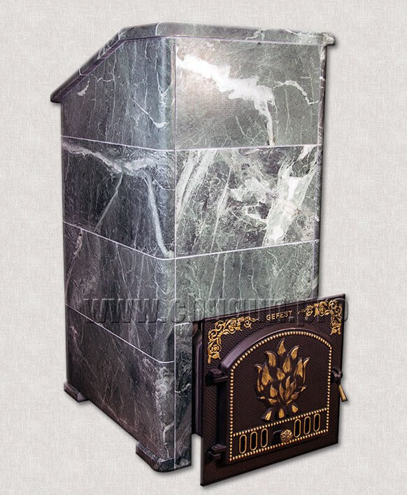 Печь на твердом топливе Гефест ПБ-01 Президент в талькомагнезите оптимальный вариант для быстрого нагрева бань, саун. Высококачественный чугун и каменная натуральная облицовка участвует в выработке мелкого теплого пара. Вода при контакте с поверхностью обогащается природными минералами и не теряет экологическую чистоту, пользу для здоровья.