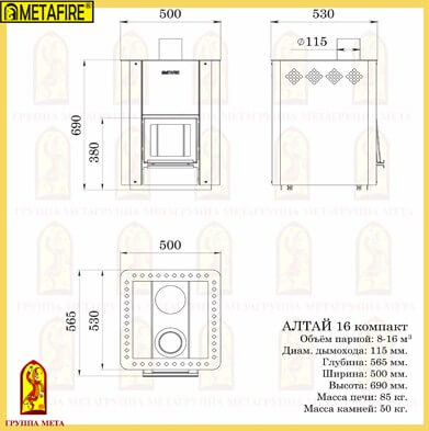 Алтай 16 Компакт идеально подходит для небольших парилок и бань. Объем протапливаемых с ее помощью помещений находится в диапазоне от 8 до 16 м3. В качестве основного вида топлива применяются дрова любых пород дерева. Функциональная каменка вмешает в себе до 50 кг камней, что позволяет создать необходимое количество пара и установить приятный микроклимат в помещении. Стенки печи изготовлены из высококачественной стали с толщиной 6 мм и покрыты слоем жаропрочной эмали. Толщина верхней части топки составляет 8 мм. Печь «Алтай 16 Компакт» активно используется для финских саун.