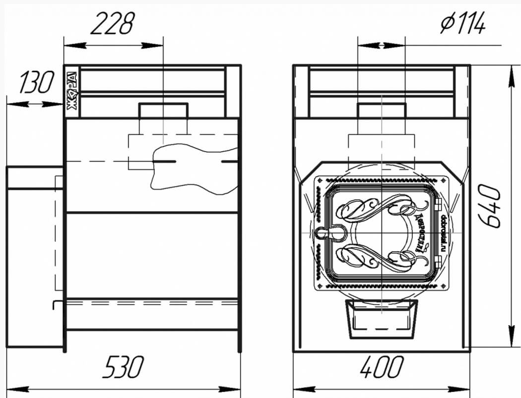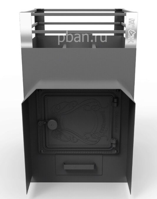 Предназначена для отопления бань объемом 4-12 м3. Печь работает на твердом топливе. Максимальная длина дров – до 37 см. Толщина свода топки 5 мм. Особенность конструкции печи позволяет прикреплять к ней бак для нагревания воды объемом от 20 до 100 л. Также печь оснащена открытой каменкой, вмещающей до 60 кг камней. Есть в наличии выдвижной зольный ящик, который позволяет регулировать уровень тяги и контролировать процесс горения.