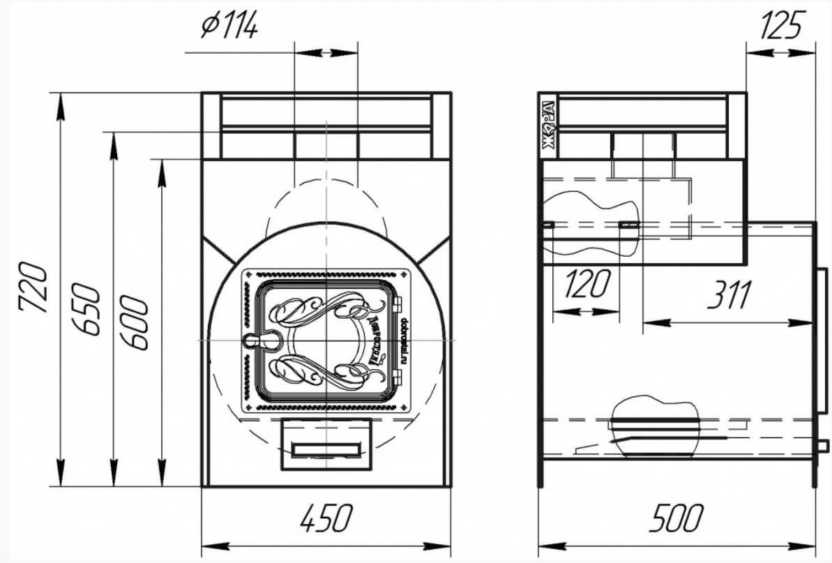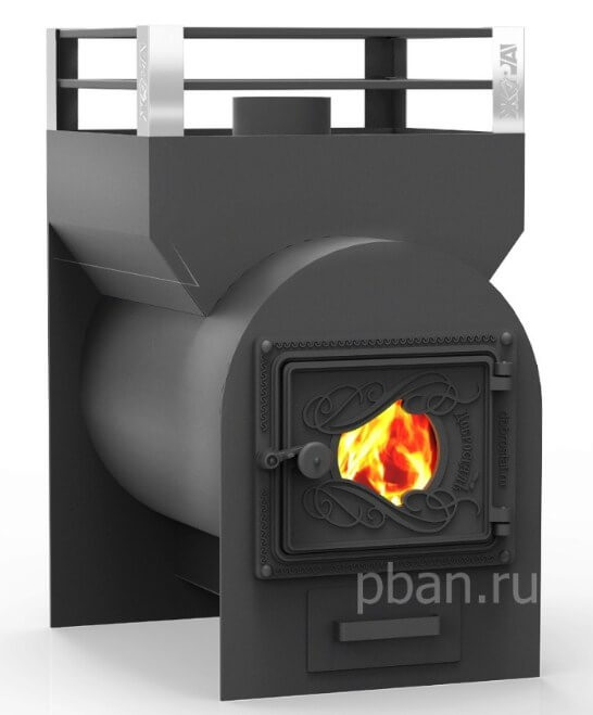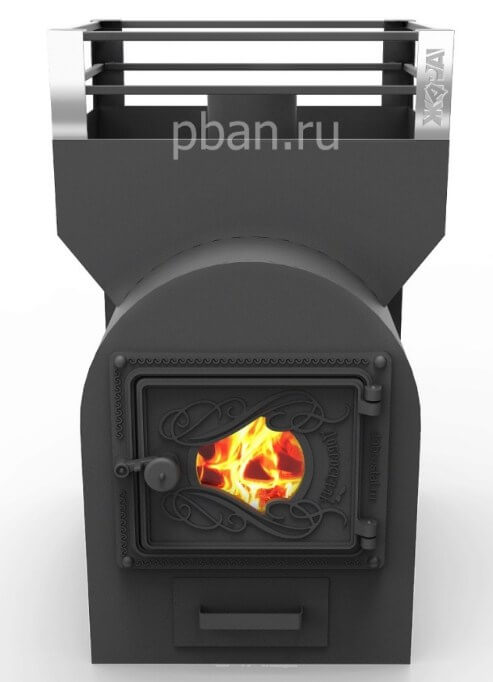 Относится к печам закрытого типа. Топливо – древесина. Имеет стальной корпус. Окрас – черный. Предназначена для отопления бань объемом до 16 м3. Отопление осуществляется либо с предбанника, либо с улицы. Печь имеет выдвижной зольный ящик, глубокую топку и дымоход с системой верхнего подключения. Толщина свода топки – 6 мм. Дополнительно возможна комплектация бака для воды.