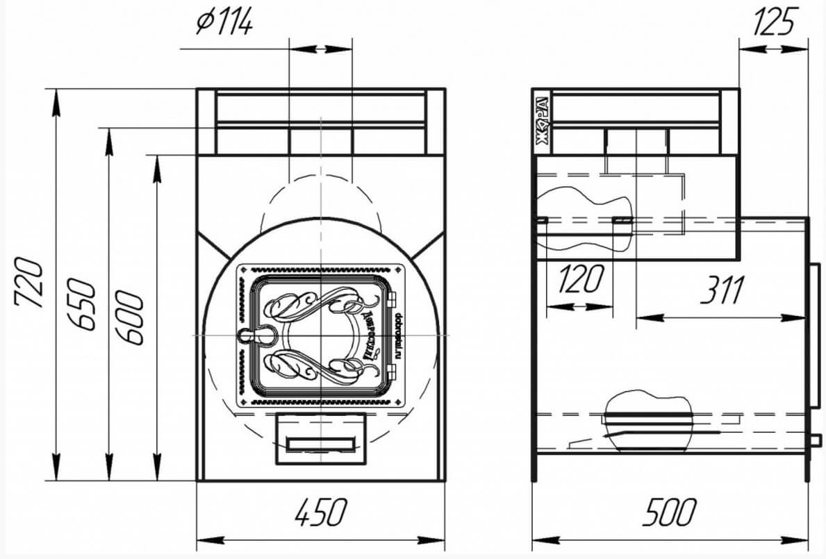 Рассчитана на отопления помещений объемом от 6 до 16 м3. Процесс топки осуществляется с предбанника или улицы. Из топлива используются дрова. Длина поленьев не должна превышать 47 см. Каменка вмещает до 70 кг камней. Есть дымоход с диаметром 114 мм. Регулировать тягу печи можно с помощью выдвижного зольного ящика.