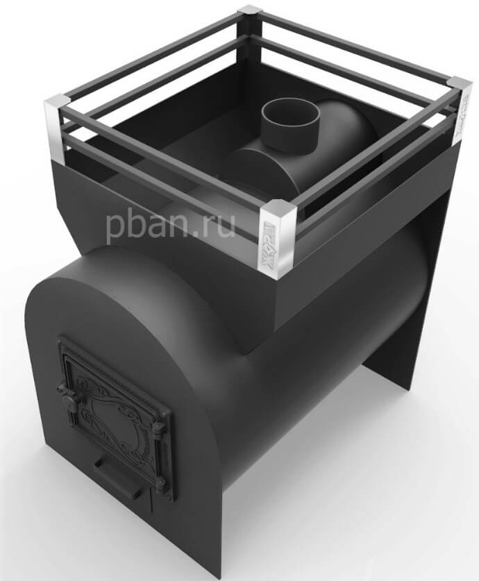 Напольная печь для бани. Максимальный объем отапливаемого помещения – 40 м3. Основное топливо – дрова (максимальная длина – 67 см). Печь устанавливается либо в парильном помещении, либо в предбаннике. Конструкция печи стандартная. Топка глубокая, толщина сводки – 10 мм. Зольный ящик, расположенный внизу позволяет регулировать тягу. Дым выводится через дымоход, который крепится сверху.